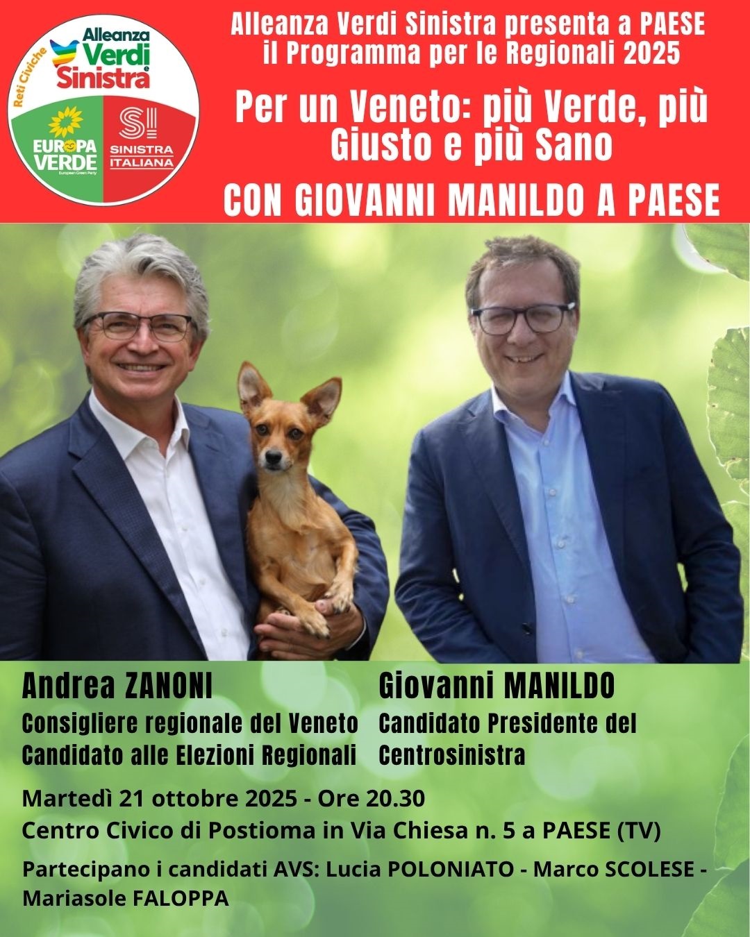 Il 21 ottobre sarò a Paese alle ore 20.30 proprio con Giovanni Manildo e i candidati AVS Lucia Poloniato, Marco Scolese e Mariasole Faloppa.