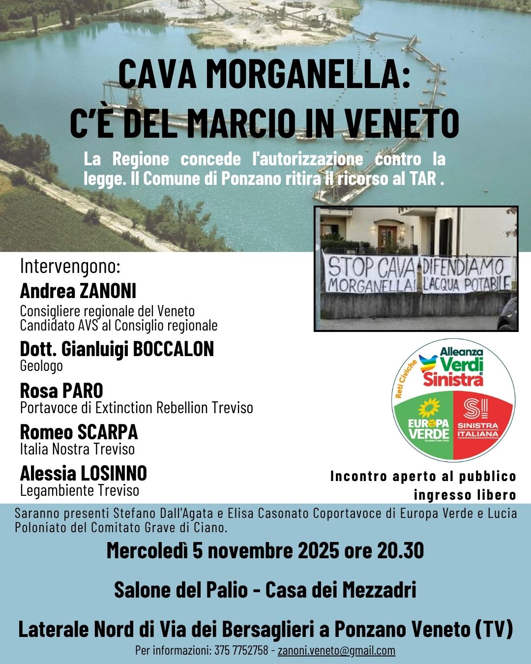 Mercoledì 5 novembre alle ore 20.30 sarò a Ponzano Veneto per un incontro pubblico dal titolo “CAVA MORGANELLA: C’È DEL MARCIO IN VENETO. La Regione concede l’autorizzazione contro la legge. Il Comune di Ponzano ritira il ricorso al TAR”.