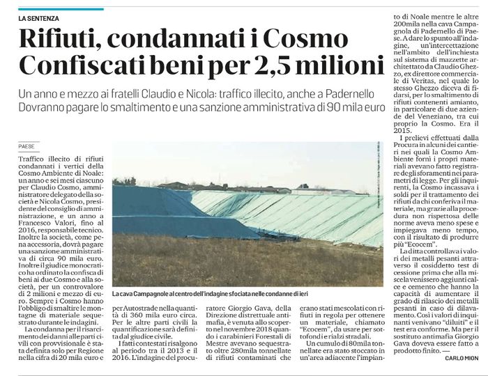 Questo il commento del consigliere regionale del PD Veneto, Andrea Zanoni, in merito alla condanna dei vertici della Cosmo Ambiente di Noale. Come riferisce la stampa, un anno e sei mesi ciascuno per Claudio Cosmo, amministratore delegato della società e Nicola Cosmo, presidente del consiglio di amministrazione, e un anno a Francesco Valori, fino al 2016, responsabile tecnico. Inoltre la società, come pena accessoria, dovrà pagare una sanzione amministrativa di circa 90 mila euro. Inoltre il giudice monocratico ha ordinato la confisca di beni ai due Cosmo e alla società, per un controvalore di 2 milioni e mezzo di euro. Sempre i Cosmo hanno l’obbligo di smaltire le montagne di materiale sequestrato durante le indagini. La condanna per il risarcimento dei danni alle parti civili con provvisionale è stata definita solo per Regione nella cifra di 20 mila euro e per Autostrade nella quantità di 360 mila euro circa. Per le altre parti civili la quantificazione sarà definita dal giudice civile.