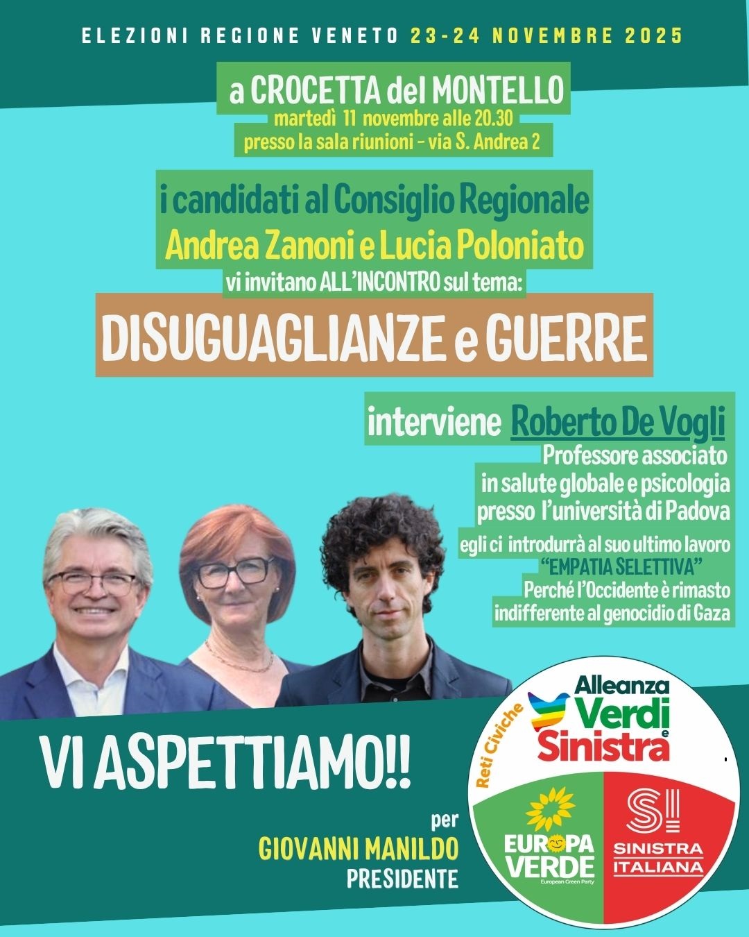 Insieme a me e a Lucia Poloniato, candidata AVS al Consiglio regionale, interverrà Roberto De Vogli, professore associato all’Università di Padova, esperto in salute globale e autore del libro “Empatia Selettiva”, che spiega perché l’Occidente è rimasto indifferente al genocidio di Gaza.