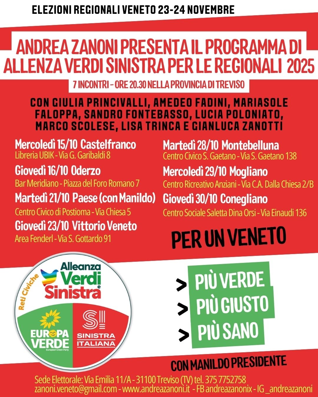 in vista delle elezioni del 23 e 24 novembre ho programmato una serie di incontri nel Trevigiano per presentare il programma di AVS – Alleanza Verdi Sinistra, della coalizione guidata dal candidato Presidente Giovanni Manildo.