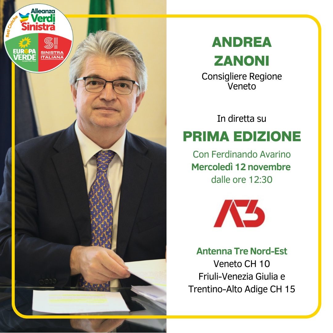 Domani, mercoledì 12 novembre, dalle ore 12.30 parteciperò in diretta alla trasmissione PRIMA EDIZIONE condotta da Ferdinando Avarino in onda su Antenna 3 Nordest canale 10 per il Veneto e canale 15 per Friuli Venezia Giulia e Trentino.