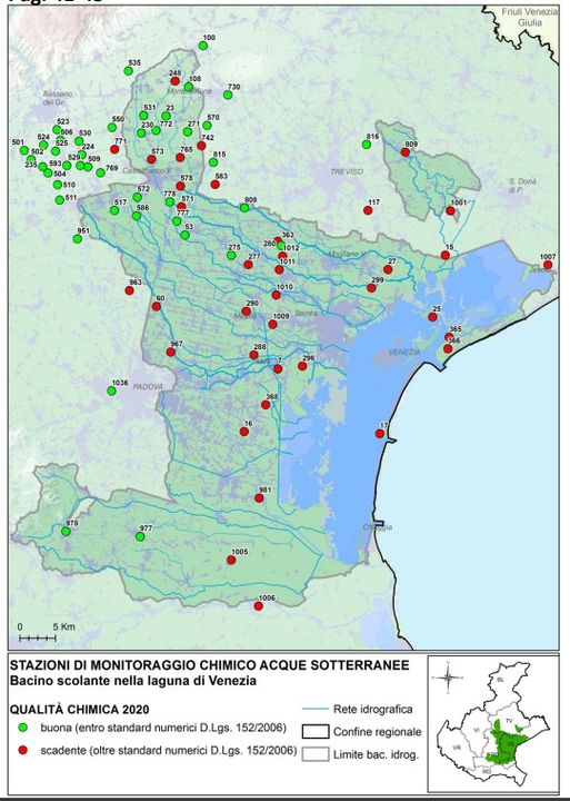 Per le falde acquifere la situazione diventa ancora più preoccupante perché ritroviamo diverse sostanze inquinanti come nel caso del comune di Castelfranco Veneto (TV) per nitrati e metolachlor esa, di Loria (TV) per pesticidi totali, nitrati, metolachlor e metolachlor esa, di Resana (TV) per tricloroetilene e tetracloroetilene, di Riese Pio X (TV) per metolachlor esa, di Vedelago (TV) per pesticidi totali, nitrati e metolachlor esa, di Maser (TV) per atrazina, desetil e desisopropil, di Casale sul Sile, Resana, Zero Branco, San Biagio di Callalta (TV) e Salzano (VE) tutti per metolachlor esa e di Jesolo (VE) per boro e solfati. Stiamo andando a sbattere, abbiamo sempre meno acqua e sempre piu’ inquinata. Serve cambiare chi ci governa e lavorare per un’agricoltura sostenibile, che si occupi di produrre piu’ alimenti per l’uomo e meno per gli allevamenti intensivi, che punti a produzioni biologiche e ad un utilizzo responsabile dell’acqua. Andrea Zanoni