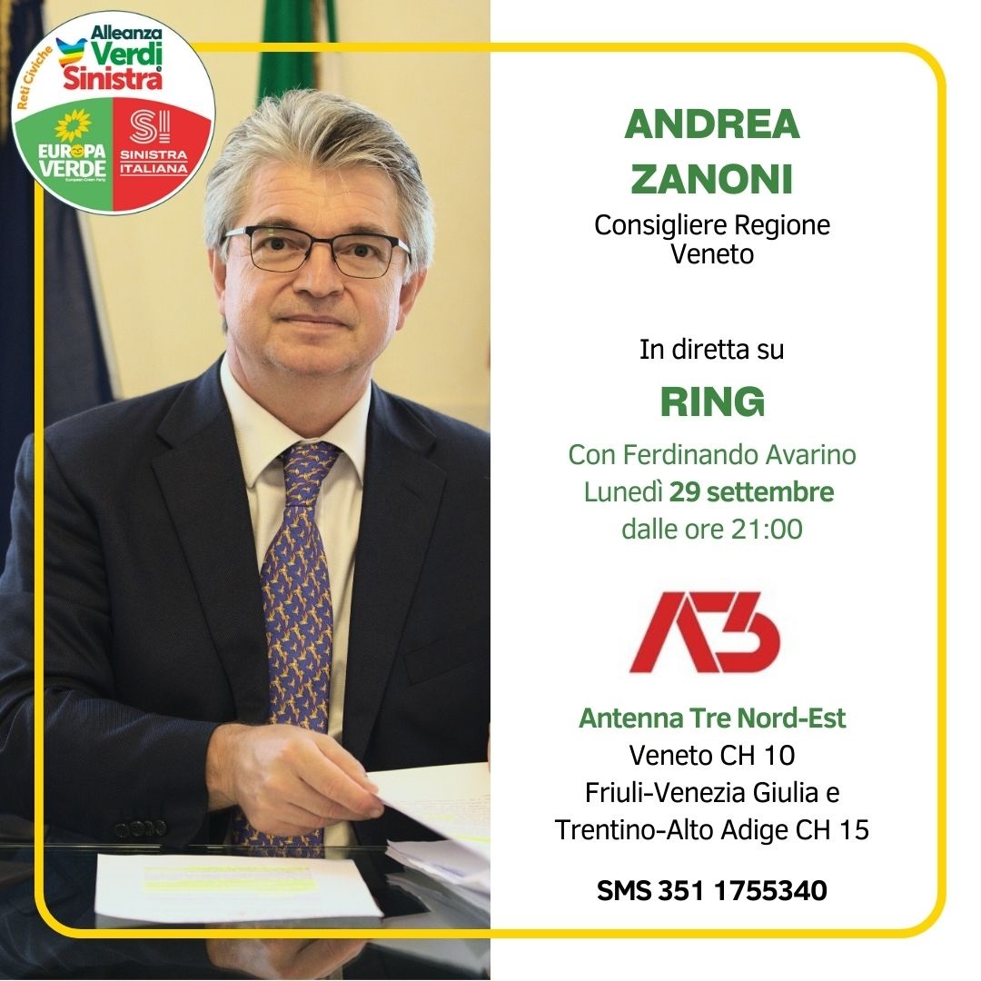 Questa sera, lunedì 29 settembre, alle ore 21.00 parteciperò in diretta alla trasmissione RING condotta da Ferdinando Avarino in onda su Antenna 3 Nordest canale 10 per il Veneto e canale 15 per Friuli Venezia Giulia e Trentino.