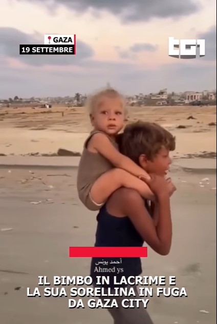 Questo video mi ha gelato il sangue. Non è un’immagine costruita, non è un film. È la storia vera, e straziante, di un’infanzia rubata. Un bambino scalzo, con le lacrime agli occhi, che si fa carico della sorellina più piccola mentre scappano dalle bombe. Un’immagine che grida un dolore che noi, da lontano, fatichiamo a immaginare.